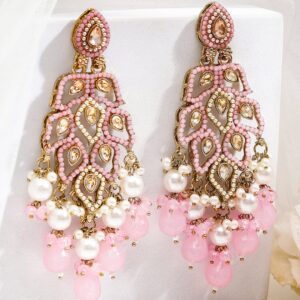 Pastel Pink Kundan Chandelier Earrings with Pearl Embellishments – Statement Artificial Jewelry