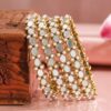 Embrace traditional elegance with this set of 4 mirror-studded bangles adorned with pearl beads along the edges. Expertly crafted on a sturdy brass base and finished in gold or antique gold, each bangle features reflective mirror detailing set amongst gleaming white pearl accents, creating a rich, festive appearance. Lightweight given their bold look, the bangles are easy to wear with a comfortable slip-on fit. This versatile set enhances ethnic, festive, or party attire, making it suitable for weddings, cultural events, or joyful gatherings. The intricate craftsmanship highlights the interplay of sparkling mirrors and pearls, elevating any ensemble with glimmer and sophistication.