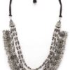 Step into the spotlight with this oxidised silver-toned multi-layer statement necklace, expertly crafted from high-quality artificial materials for a dynamic, eye-catching look. Featuring three intricately beaded layers adorned with detailed floral disc motifs and delicate fringed embellishments, this necklace brings a bold, ethnic flair to festive wear and casual ensembles alike. The adjustable black thread closure ensures a comfortable and customizable fit, making it perfect for day-long events, cultural festivals, or adding a touch of drama to everyday outfits.