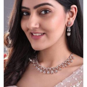 • Description: Vibrant gold tone choker set adorned with multi-hued stones, faux kundan, and pearl bead hangings. Matching earrings complement the geometric, star-inspired motif, making it perfect for weddings, celebrations, and cultural events.