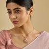 This elegant statement pendant showcases a stunning teardrop-shaped center stone, embraced by two rows of shimmering white accents. The outer row features a delicate leafy pattern, adding a touch of vintage artistry and brilliance to the overall design. Suitable for both occasions and everyday elegance, this pendant elegantly complements traditional attires, formal ensembles, and contemporary outfits. Its eye-catching design and intricate craftsmanship make it a perfect choice for gifting or elevating a jewellery collection with refined sophistication. The pendant is versatile for use on chains of various thicknesses, ensuring flexibility in styling preferences.